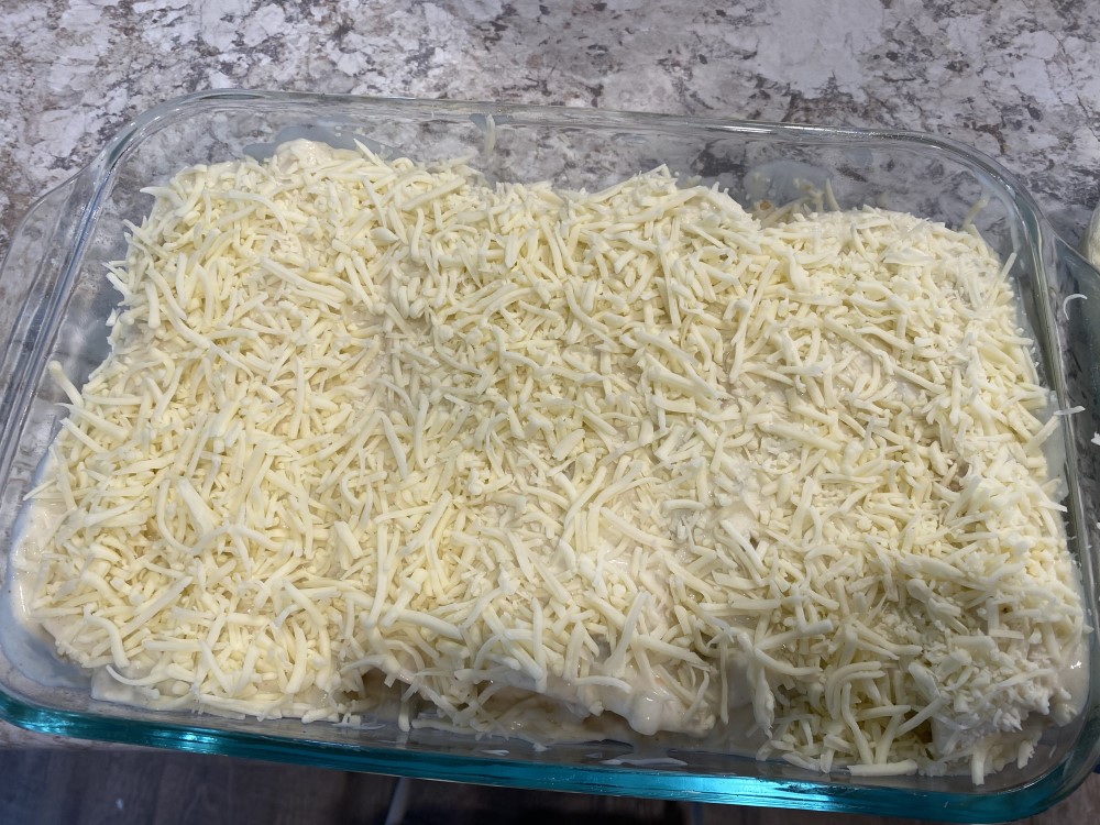 - Top the enchiladas with the sauce and then sprinkle the rest of the cheese on top.