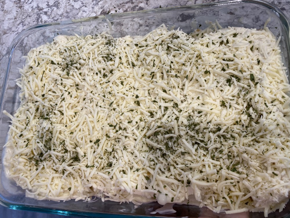 If you want, you can also sprinkle parsley or cillantro over the top for some color and a bit of added flavor. Bake in a preheated oven at 400 degrees for about 20 minutes.