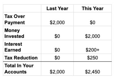 The IRA or HSA is set up and humming along with your initial refund check as the deposit. Now take that extra bit of money we just found by adjusting your withholding amounts… remember the $77 a pay period… and set up automatic payments to your new investment account. At the end of the year you put in the same $2,000 you were giving the government, so it didn’t affect your bottom line at all. You’ve also earned around $200 in interest and will save another $250+ off next years taxes!