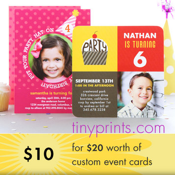 Zulily has a great half price voucher deal for one of my favorite photo announcement sites. For $10, you’ll get a $20 certificate to Tiny Prints! These are really awesome personalized cards or invites if you have an event or birthday party coming up!